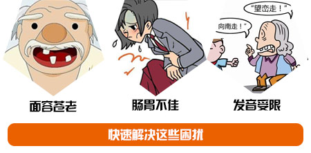 长期缺牙不治疗,容易造成余牙倾斜形成牙间隙,继而发生食物嵌塞,引起牙周病;同时咀嚼功能的下降使得缺牙患者无法充分吸收食物,会增加肠胃负担,影响身体健康。对于中老年人而言,胃肠道消化能力的下降,让牙齿显得格外重要,所以说,老人晚年的健康长寿是需要一口好牙来支撑的。