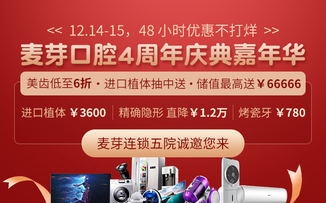 为了让更多朋友拥有一口整齐靓丽的牙齿,麦芽口腔4周年庆典嘉年华将于12月14日正式开启,48小时优惠不打烊!不仅可以与正畸博士专家面对面问诊,还有美齿低至6折,数字化精确正畸最高减13000元,到院即领精美礼品,消费满额砸金蛋,华为mate30手机、小米智能电视、创维投影仪、扫地机器人等丰厚大礼送不停,消费越多送得越多,100%中奖。名额有限,一年仅此一次,千万不要错过!咨询热线:8233 9968。