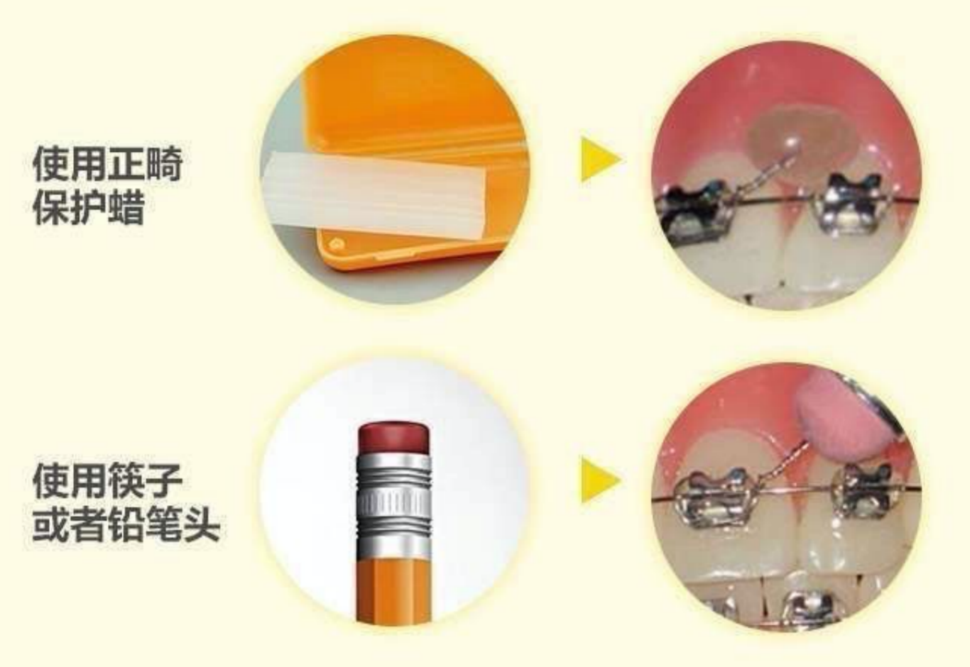 针对松脱的末端托槽,万能的正畸蜡可以包裹松动的托槽,起到暂时固定的辅助作用。另外,也可以采用钢丝剪,修剪末端的弓丝。具体操作如下图: