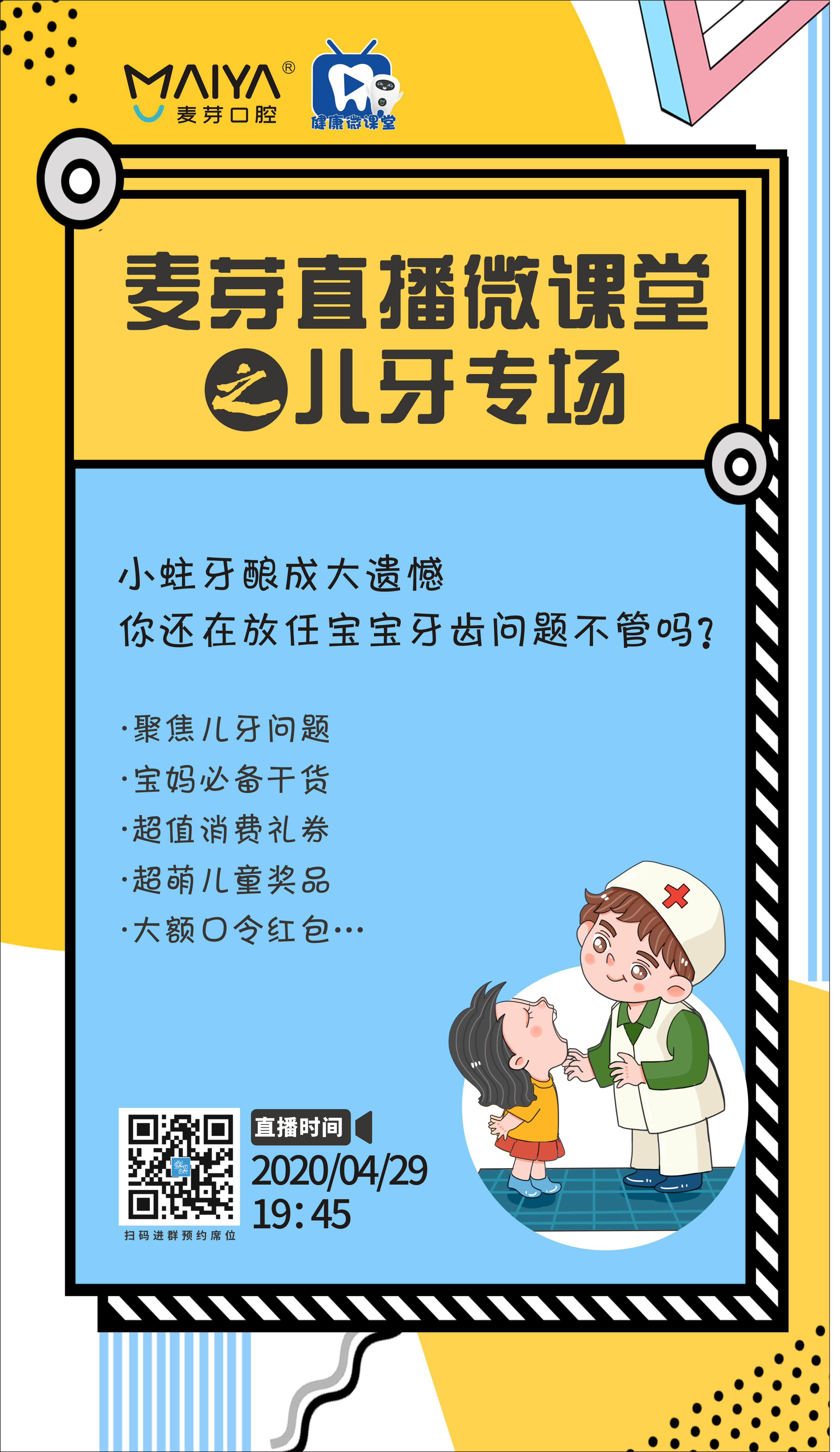 宝宝长蛀牙了怎么办?宝宝养成不良口腔习惯怎么办?提到宝宝的口腔问题,许多宝妈直犯愁。4月29日,【麦芽口腔健康微课堂】第二期聚焦儿牙问题,邀请儿童口腔专业医师线上讲解儿牙健康知识,为宝妈们的答疑解惑,帮助宝妈们培养宝宝的口腔健康好习惯。同时,参与直播可抢不定时红包雨,互动还能赢取免费儿童防蛀牙涂氟、全口窝沟封闭、洁牙、补牙、超萌儿童牙刷等超多福利,赶快扫码预约参加吧。