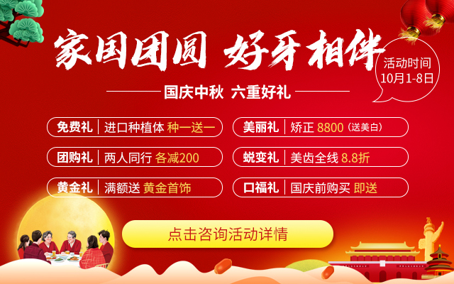 家国团圆,好牙相伴,麦芽口腔国庆中秋特享6重礼,双节免费礼-种牙享特定种植体种一送一;双节美丽礼-成人美学金属矫正特价8800元,加送诊间美白1次;亲情团购礼-两个同行立减200元;双节蜕变礼-10月1日至8日,修复治疗所有项目均享8.8折优惠;成交惊喜礼-活动期间成交即送精美礼品1份,洗漱套装、电动牙刷、黄金饰品…等你来;中秋口福礼-10月1日至8日前购买项目即送惊喜礼品1份。预约电话:0755-82339968!