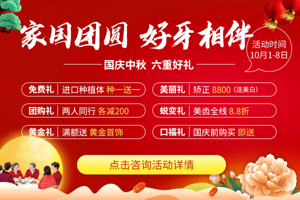 笑迎双节,礼遇金秋,为了回馈新老顾客,让更多市民关注口腔健康,关心和爱护自身和家人的牙齿,麦芽口腔特向广大消费者推出国庆中秋主题促销活动,六重壕礼享不停:双节免费礼-种牙享特定种植体种一送一;双节美丽礼-成人美学金属矫正特价8800元,加送诊间美白1次;亲情团购礼-两个同行立减200元;双节蜕变礼-10月1日至8日,修复治疗所有项目均享8.8折优惠;成交惊喜礼-活动期间消费满额即送黄金首饰、洗漱套装、电动牙刷…等你选;中秋口福礼-国庆前购买项目即送惊喜礼品1份,实实在在给予广大顾客看牙实惠。国庆中秋福利多多,名额有限,抓紧时间预约吧!预约热线:8233 9968。