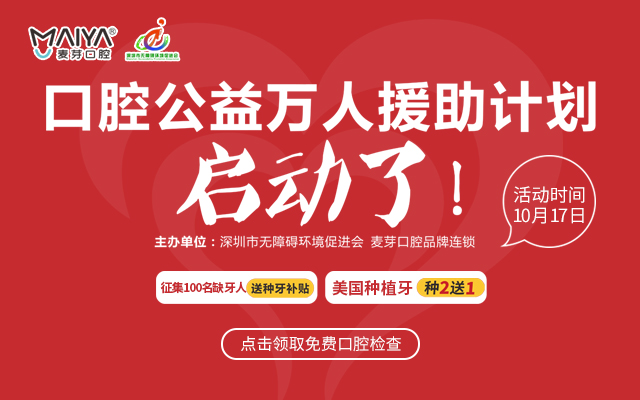 10月,麦芽口腔发起公益普查月,通过社区公益义诊、口腔健康普查、助残公益万人援助计划等形式助力公益。公益普查月活动期间,除了残障人士专项援助,针对普通人群,也有征集100名缺牙人送种牙补贴、美国种植牙种2送1、价值590元数字化种植检查大礼包免费送、3D网红黑科技口扫0元体验、口腔全面检查10元、美齿全线8.8折等诸多优惠。福利多多,不要错过,咨询热线:0755--8233 9968。