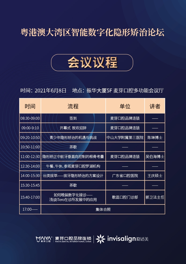 为促进华南地区口腔隐形正畸学术水平发展,展现全球口腔正畸学发展的最新态势,“智能数字化矫治·精确预见未来美”2021粤港澳大湾区智能数字化隐形矫治论坛将于6月8日盛大启幕。本届峰会由麦芽口腔品牌连锁、Invisalign隐适美联合主办,云集近200名口腔正畸领域的专家学者、优秀医生。