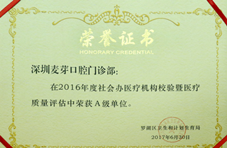 7月4日,罗湖区召开《2016年度社会办医疗机构校验·暨医疗质量评价结果通报会》在此会议上,麦芽口腔在辖区内209家医疗机构中脱颖而出,被评为罗湖区医疗质量A级机构。
