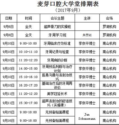 据悉,9月麦芽口腔大学堂将开展6节学术课堂,特别邀请朱丽红、李京平博士、Jan Schunemann主要针对超声骨刀的实操、牙周诊断与治疗、美学冠延长术、超声洁刮治的舒适技巧、无预备贴面等课程做培训,您可以根据课表安排在线报名参加!